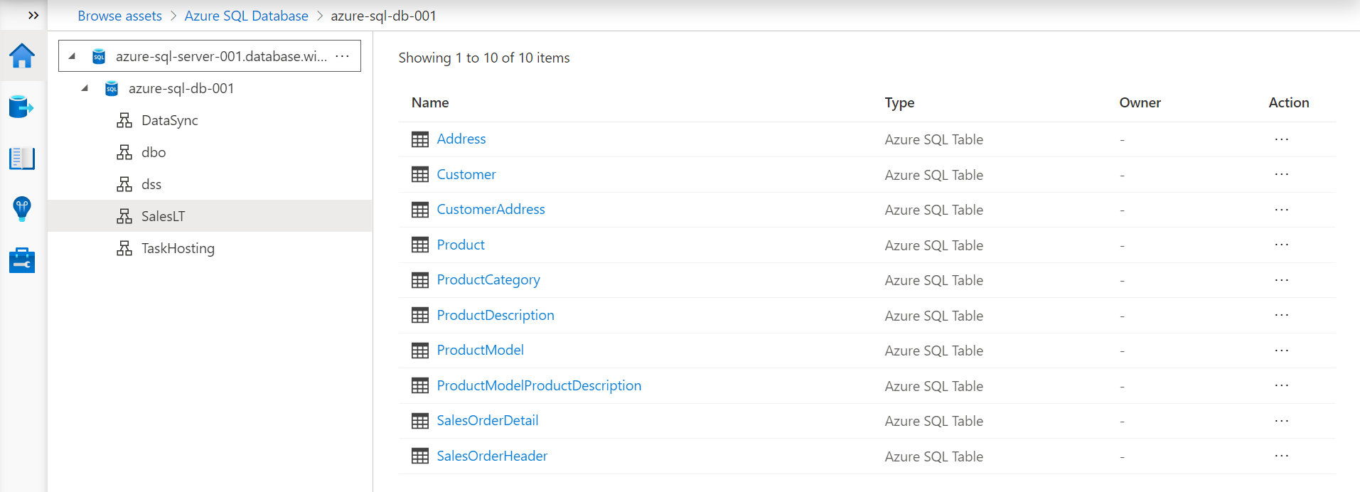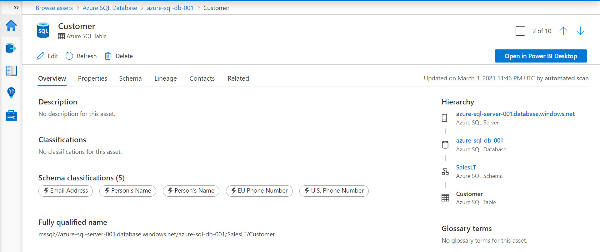 Let’s say that we intend to associate business glossary terms to the table name Customer under the SalesLT schema. Click on this table to explore the glossary terms that may be already associated with this table. When you open the table, on the right-bottom corner of the screen, you would find whether any glossary terms are already associated. In our case, no terms are already associated with this table.