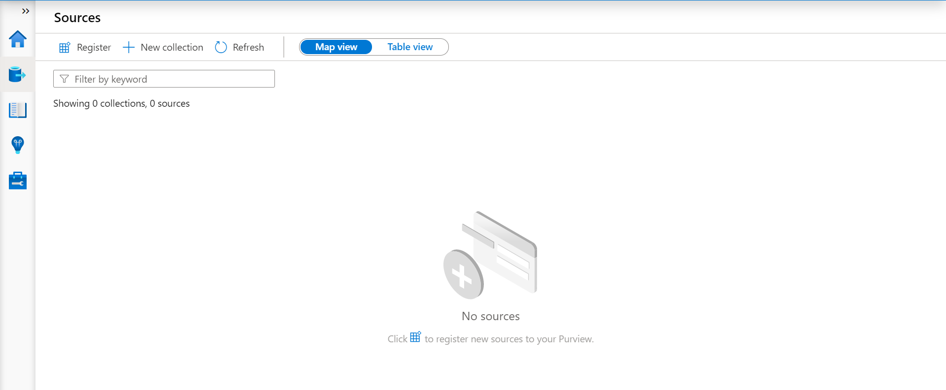 Assuming that the Azure Purview account is already in place, click on the Open Purview Studio link. This would open Purview Studio in a new window. By default, it would have no data assets registered in it. Click on the Sources section to view the list of data sources and it would look as shown below.