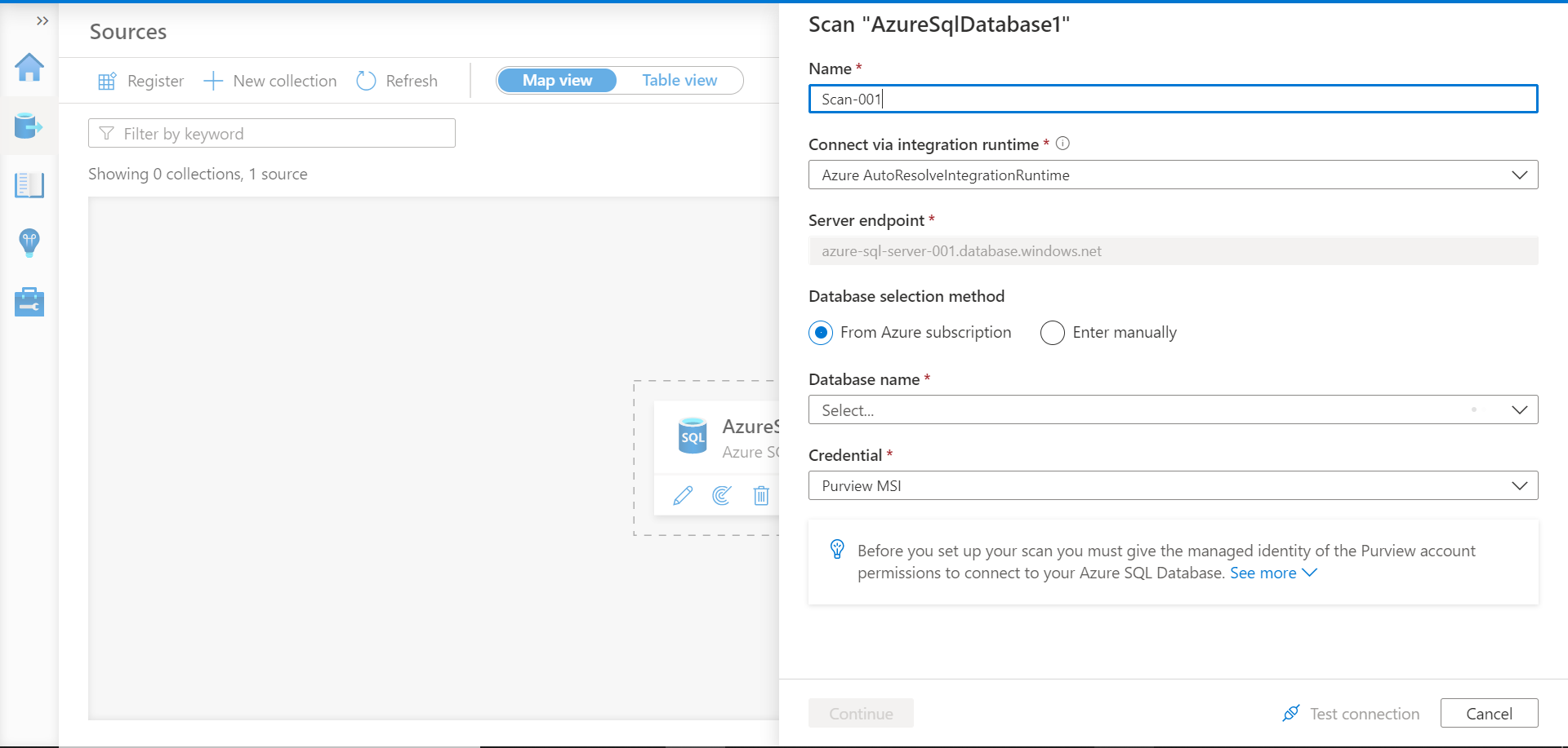 From the icons listed under the name of the data source, we need to click on the item titled New Scan. This would invoke the new scan wizard as shown below. Here we need to provide the name of the scan being scheduled and the integration runtime which it would use for conducting the scan which by default is “AutoResolveIntegrationRuntime” as shown below. The server endpoint would be populated by default based on our earlier selection of Azure SQL Database instance. We need to select the database from which we intend to scan data objects and configure the credential using which Azure Purview would access the data objects from the data repository. We can use the managed identity i.e., Purview MSI or create a specific service credential for Purview to access a specific database. More configuration details can be found by clicking the See More link in this wizard as shown below.