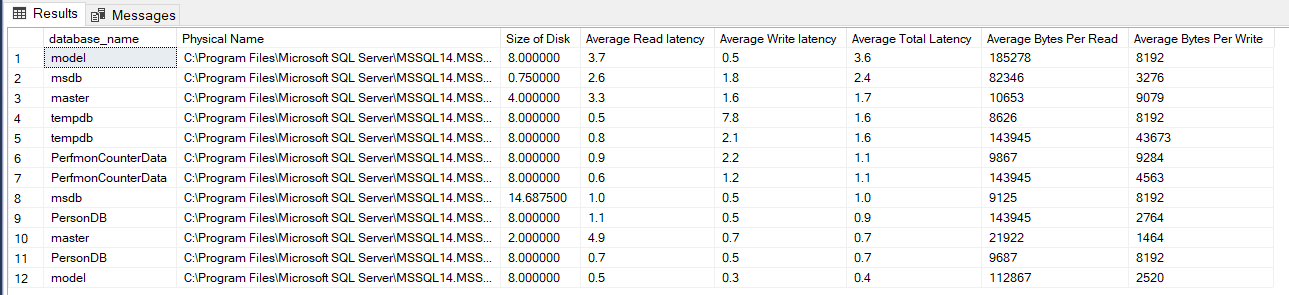 Also, we can use dm_io_virtual_file_stats dynamic view because it gives the I/O statistics of the database files. The following query will return the database file latency.