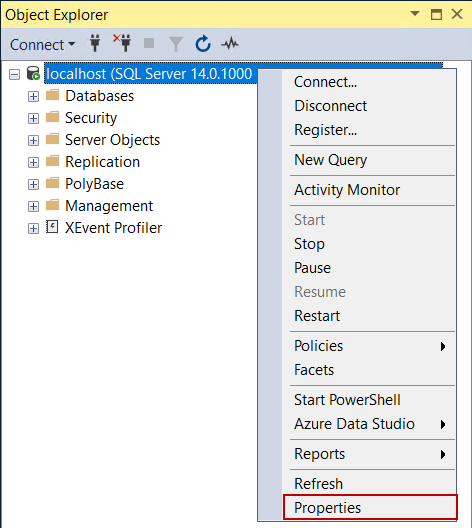 Open SSMS and right-click in the SQL Server Instance and select the Properties menu