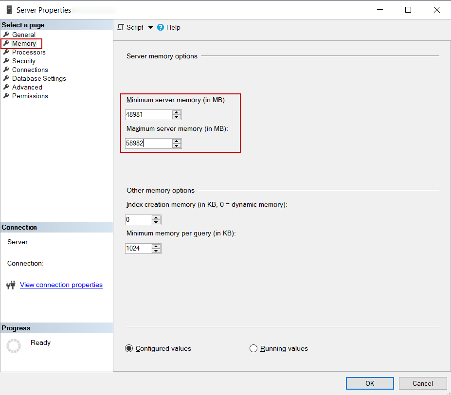 For the first 16GB of RAM, allocate 4GB for the operating system, and then add 1GB of RAM for each 8GB of RAM. For example, if our server has 64GB physical memory, we need to reserve 10GB for the operating system and 54GB RAM for SQL Server. In order to set maximum and minimum memory setting, we can use SSMS.