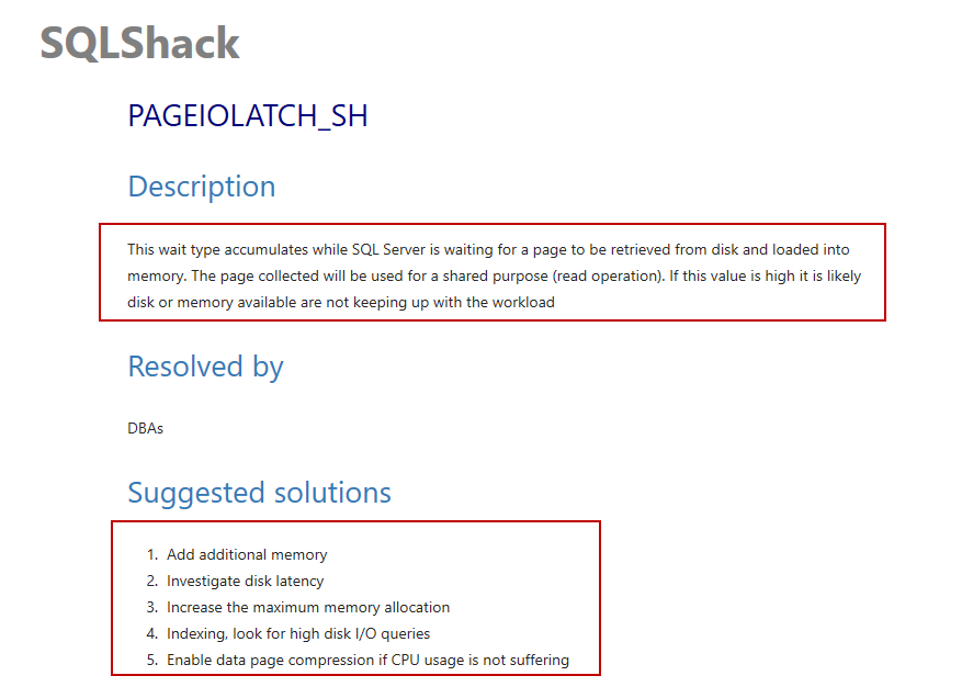 We can use the SQL Server wait types dictionary to find the description of the wait types. This allows us to have clearer information about which issue is indicated by the wait_type column. However, the wait statistics solely will not be enough to diagnose the root of the problem therefore we need to use other DMV’s and tools to find out the crux of the problem. Such as the Performance Monitor (Perfmon) can help to identify the problem more clearly. Assume that, we see the PAGEIOLATCH_SH wait type has the biggest wait time. In this circumstance, at first, we can read the PAGEIOLATCH_SH description and suggested solutions.