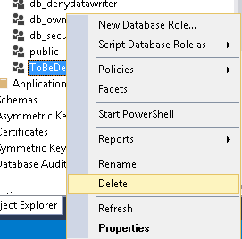 Right-click on the Database Role you want to delete and click on “Delete”.