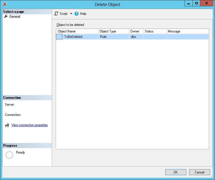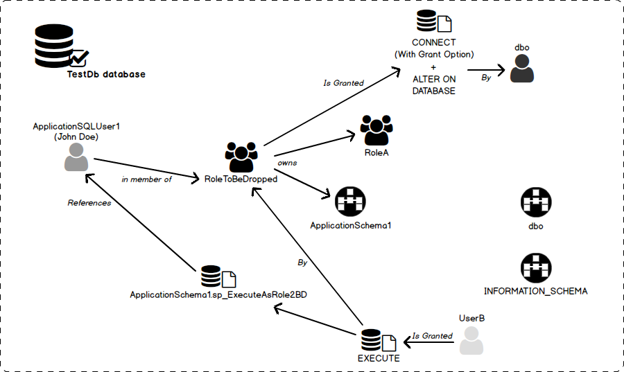 In this section, we will present the test case situation to which we will refer in the remaining of this article and where we want to drop a database role called RoleToBeDropped.