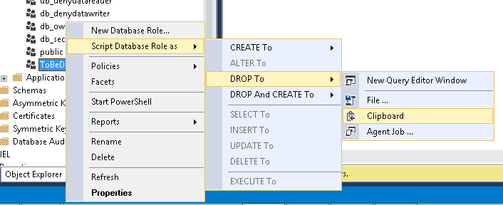 In fact, if we generate the T-SQL statement that will drop the [ToBeDropped] database role, we may be surprised of the results.