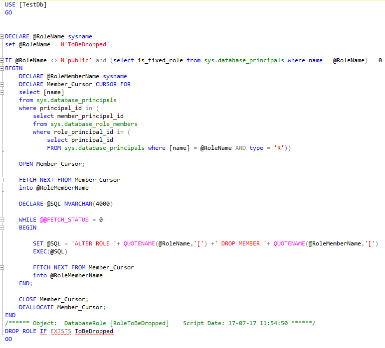 - Finally, it will drop the database role. This could be seen as a bug but it will generate an IF EXISTS argument even when the instance version is below 2016.