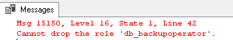 It will check if the role is defined by Microsoft and we could expect a modified version of this script to fail whenever the database role is fixed (although there is no explicit RAISERROR instruction). Actually, here is the message we’d get if we try to drop [db_backupoperator] database role: