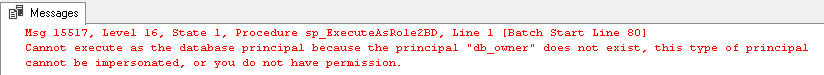 In that article, we also concluded that we had to check for programmable database objects (procedure, function…) using the database user as execution context. We will ignore this case in our tests because, in SQL Server 2012 (and maybe in higher versions), a database role cannot be impersonated. To be convinced, we could give a try and run following statement that creates a stored procedure which should be executed as db_owner built-in database role.