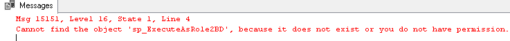 This is due to the fact that [dbo] users, even if it’s in db_owner database role does not have sufficient permissions to run this statement. In fact, in order to do this, we should first grant [dbo] the permission to execute the stored procedure and to share this permission: