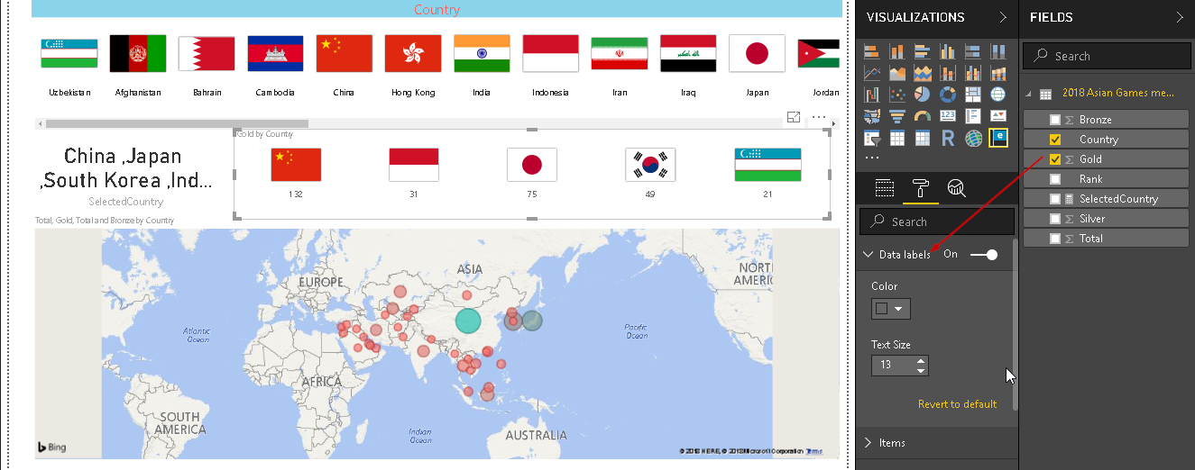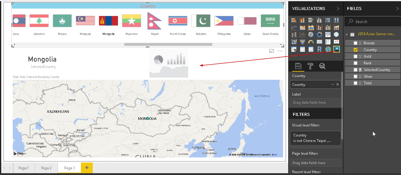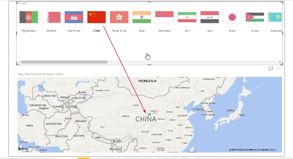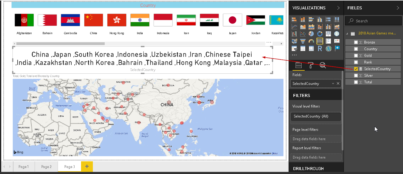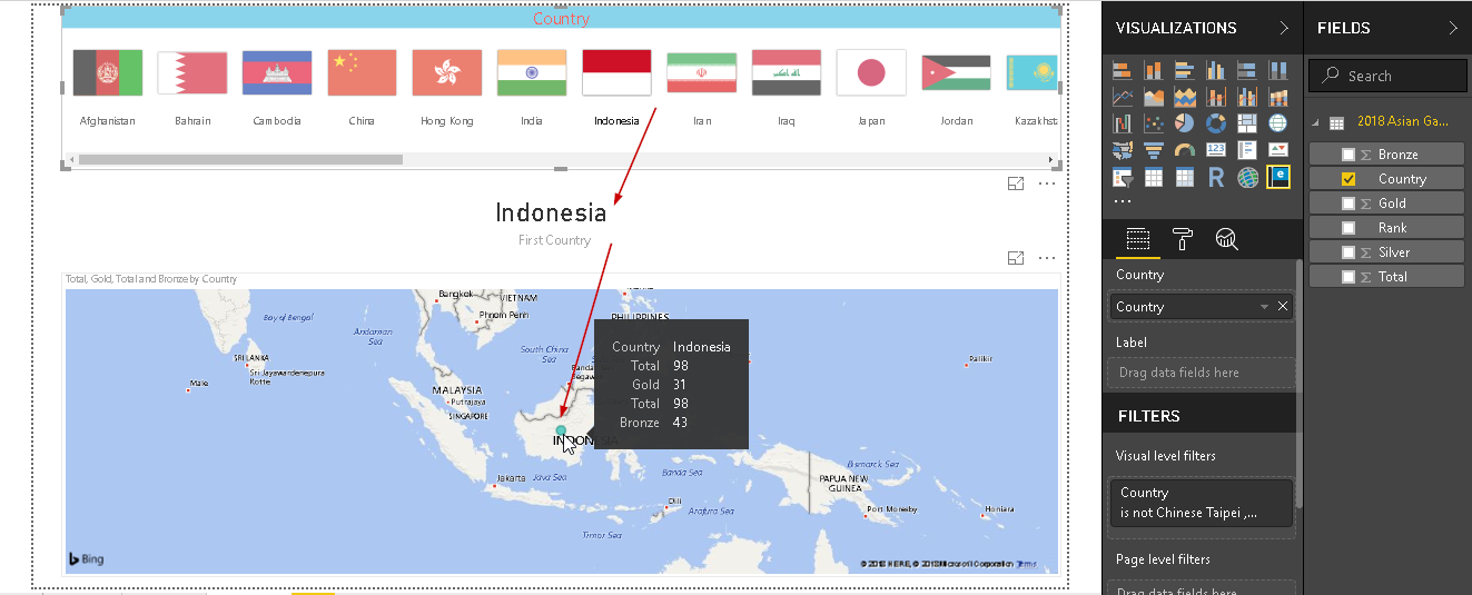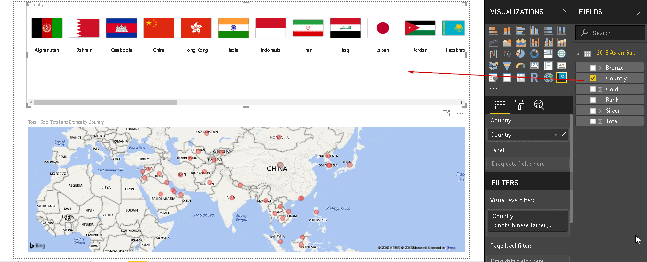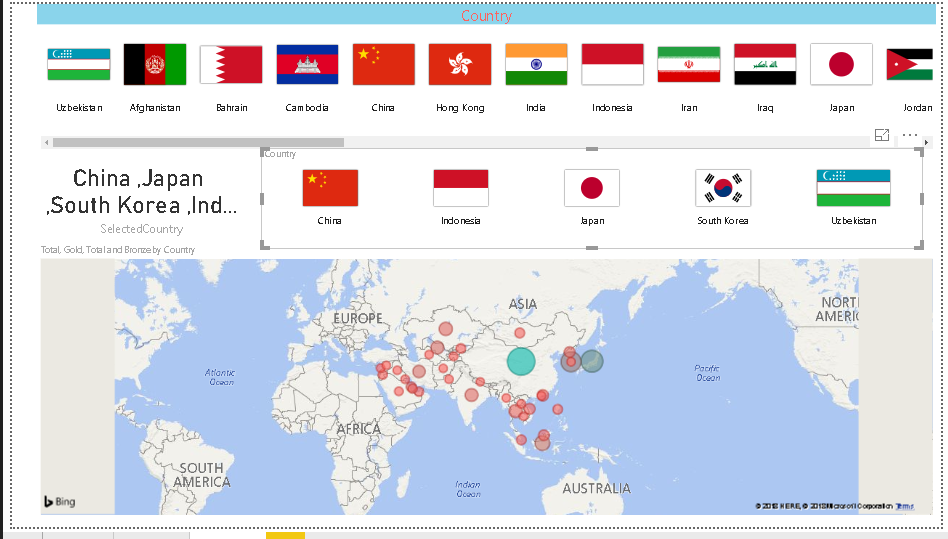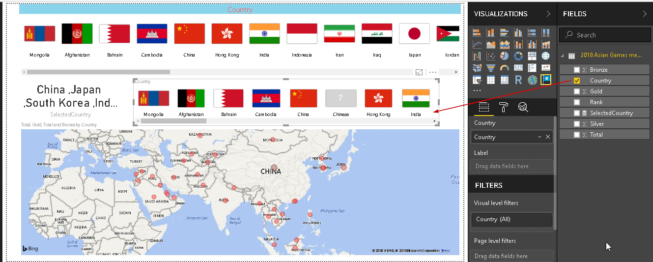 Suppose we want to prepare a report to examine the 2018 Asian Games medal table using Power BI Desktop. In the report, Enlighten World Flag Slicer is helpful to visualize the data from the dataset and represent country names with their flags. This represents the country with flags symbol and we can filter out the report for the country just by click on the respective country flag.