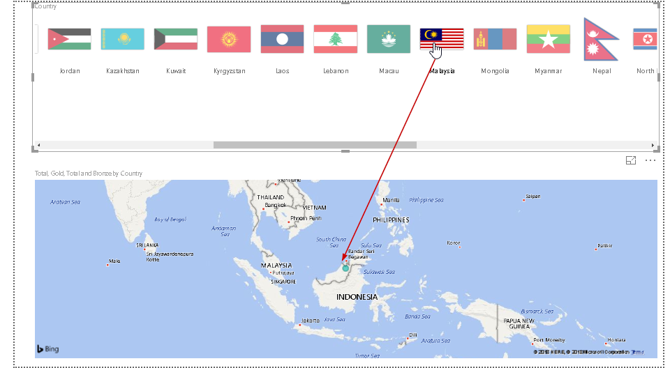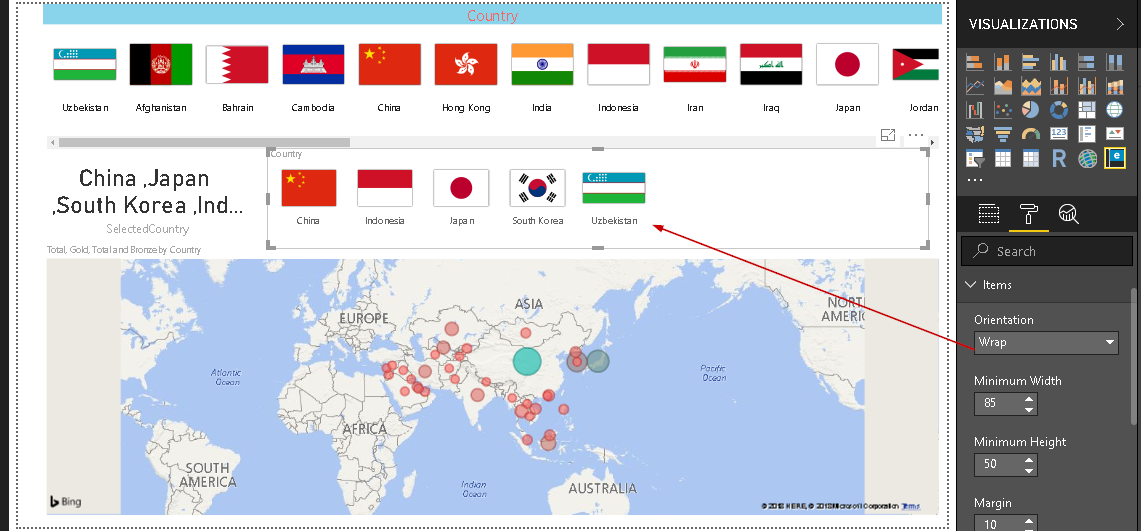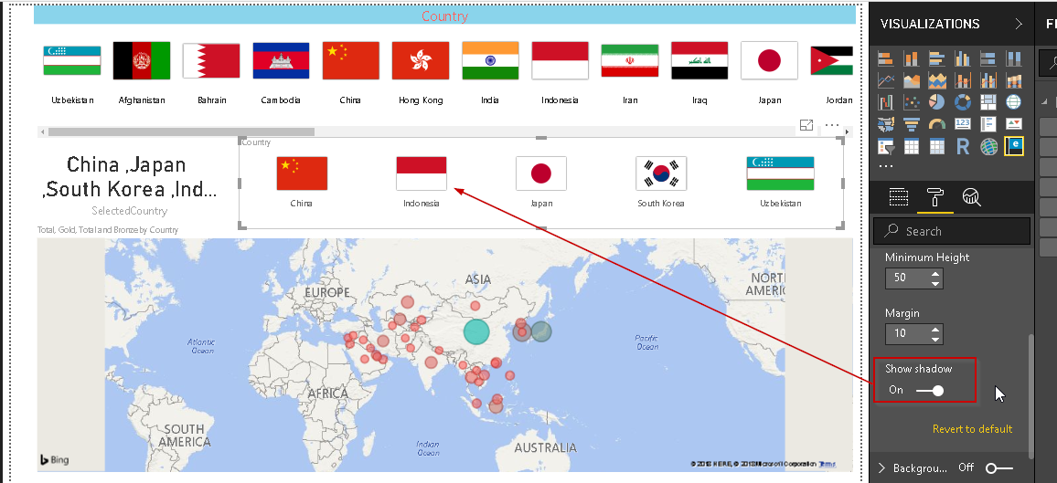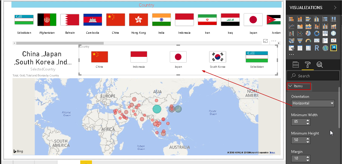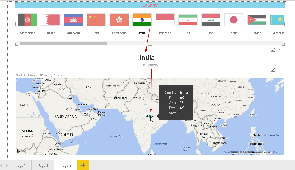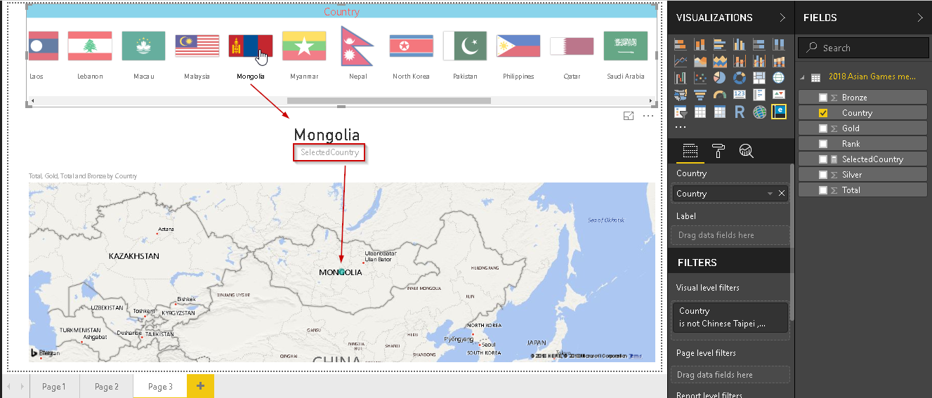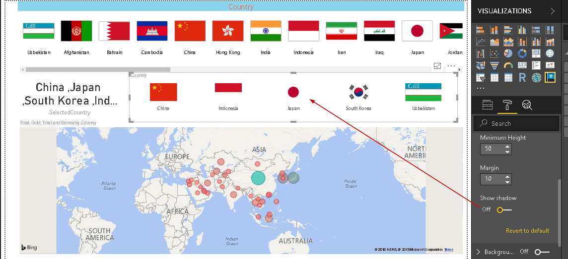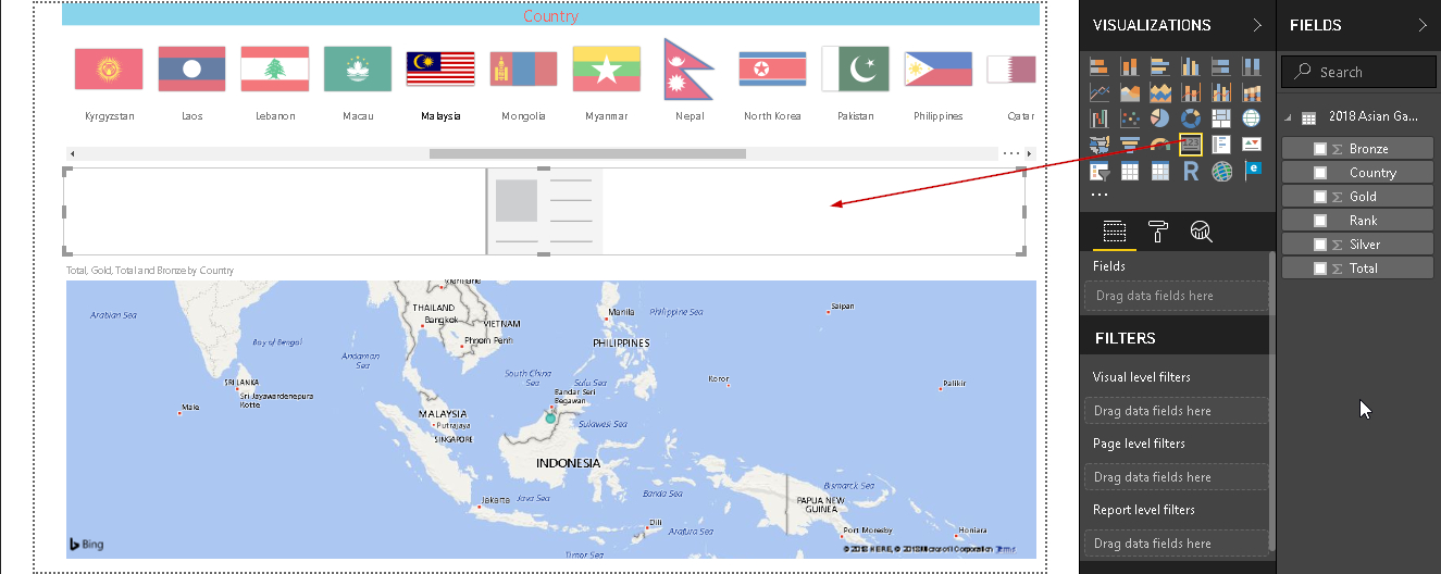 Suppose we want to prepare a report to examine the 2018 Asian Games medal table using Power BI Desktop. In the report, Enlighten World Flag Slicer is helpful to visualize the data from the dataset and represent country names with their flags. This represents the country with flags symbol and we can filter out the report for the country just by click on the respective country flag.