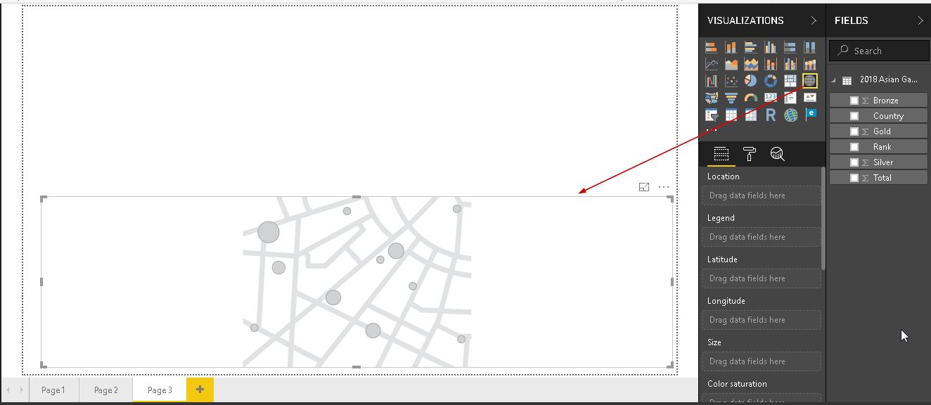 Before we create the enlighten world flag slicer visual, let us create ‘Map’ chart from our data set. Double click on ‘Map’ chart icon as shown and adjust the chart height width in the bottom part of the screen.