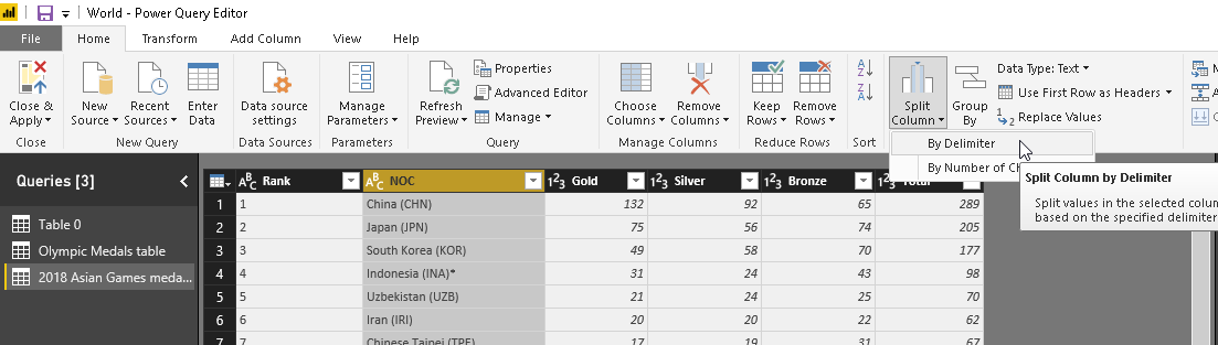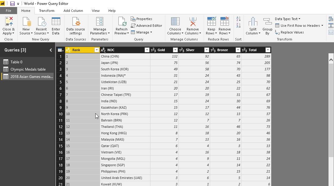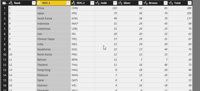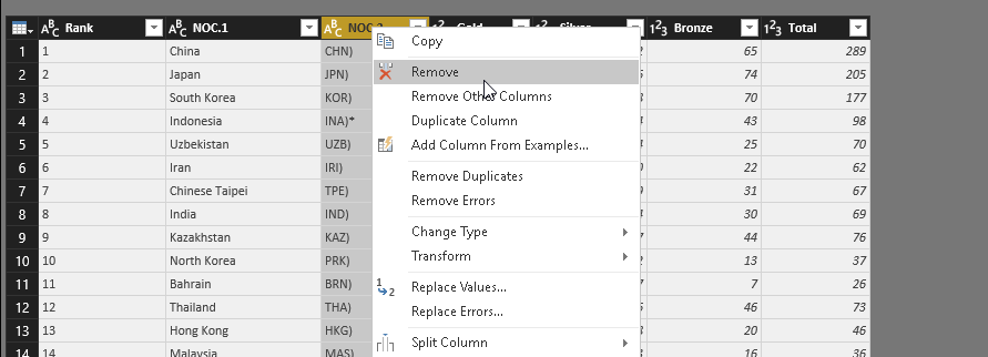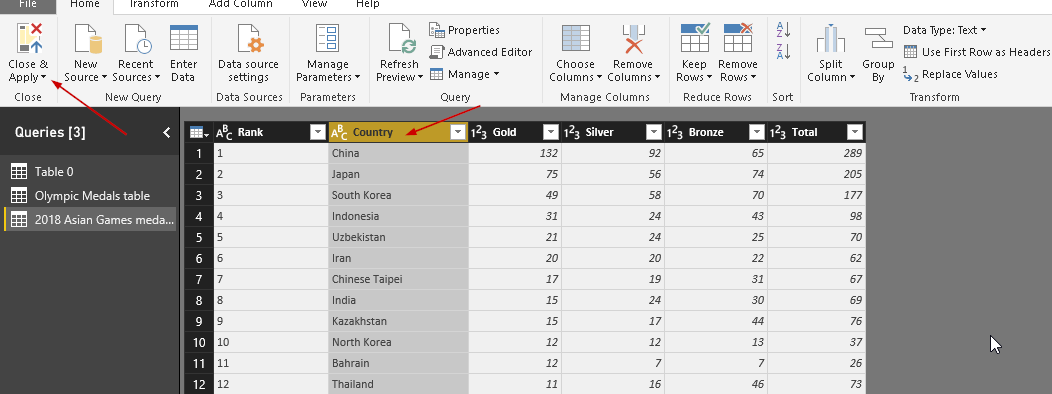 Also, rename the column name from ‘NOC’ to ‘Country’. Close and apply to save changes.