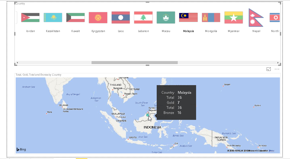 If we hover the mouse over the dot representing country, you can see details of medals won by that particular country. For example, below you can find details of ‘Malaysia’ country medals.