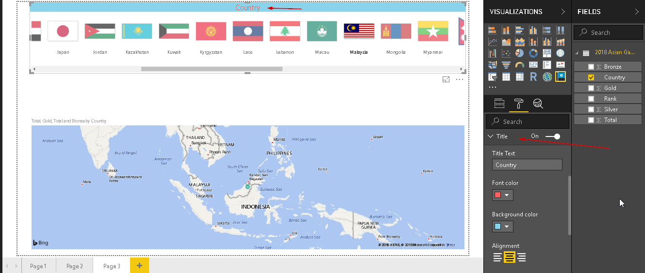 Now, we will do a little bit of formatting for our enlighten world flag slicer visual. In the format area, click on ‘Title’ and modify the title properties such as font color, background, alignment etc. This will provide a better look for our chart title.