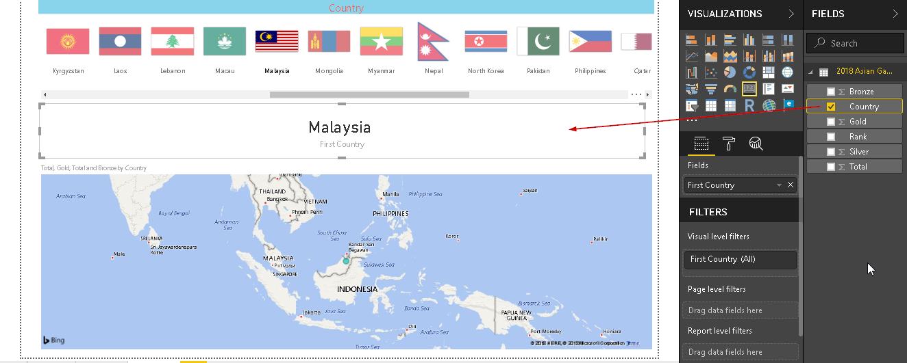 Select the chart and click on a country from the dataset. Now, it will show the name of the country we selected from the flags. For example, below it shows Malaysia.