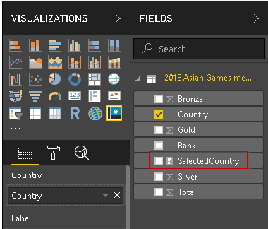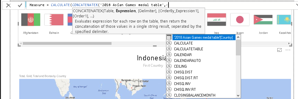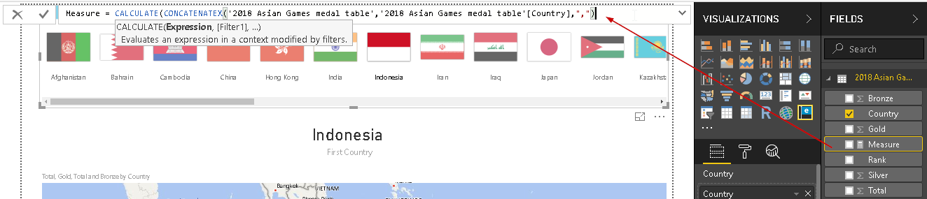 Measure = CALCULATE(CONCATENATEX(‘2018 Asian Games medal table’,’2018 Asian Games medal table'[Country],”,”))
