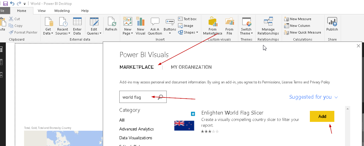 Now, we will import the ‘Enlighten World Flag Slicer’ visual from the Marketplace. Search it and add as shown below.