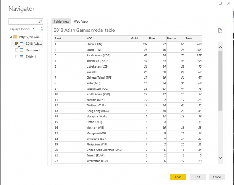 In this article, we will take data from the Wikipedia 2018 Asian Games medal table. In Power BI Desktop, we can directly fetch data from the web data source and prepare chart from it without exporting data into excel or flat file format. Launch the web data source from Get Data -> Web