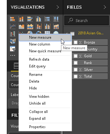 We still have one issue with our report. In the above example, you can notice that whichever country we select, it shows ‘First Country’ below the country name. In order to address this, let us create another ‘Measure’ column in the dataset. Right, click on the dataset and select ‘New Measure’.