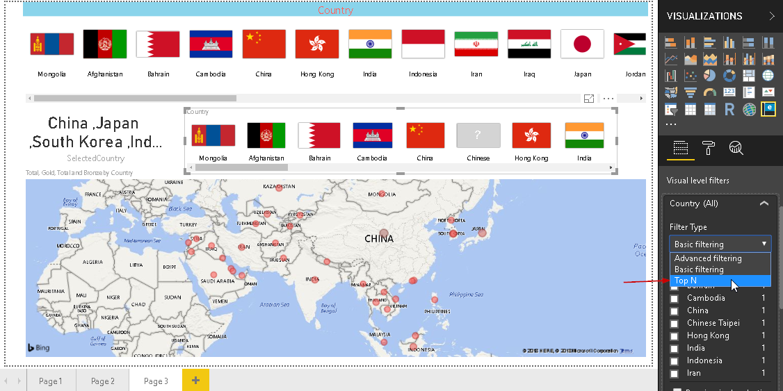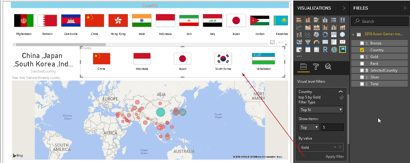 Enter the number of items we want to show. Below this, we can select how to want this filter to apply. For example, in my example, I want to select top countries based on the total number of gold medals. You can see now only top 5 countries flags are displayed.
