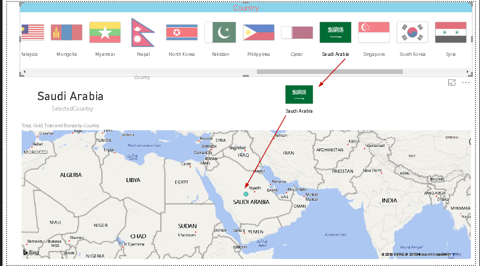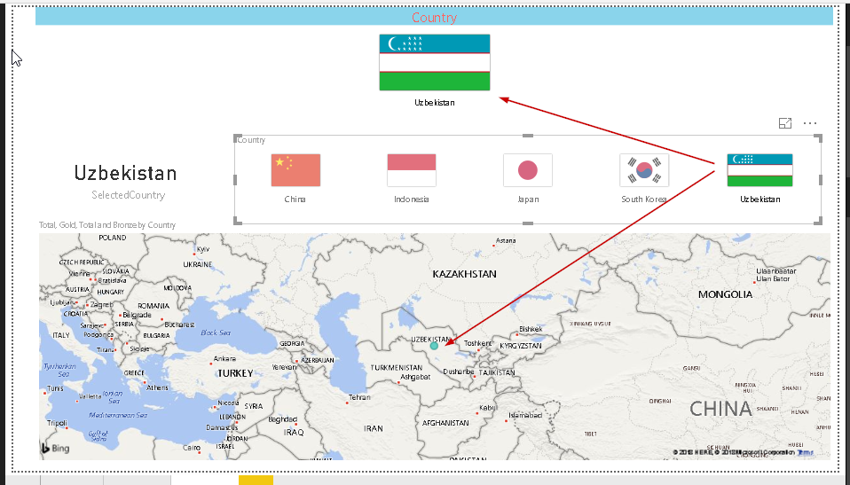 As shown above, when we click on any particular country, map redirects to that country. We cannot find the selected country from the flags since it is not highlighted. Therefore, let us add another chart ‘Card’ into the area.