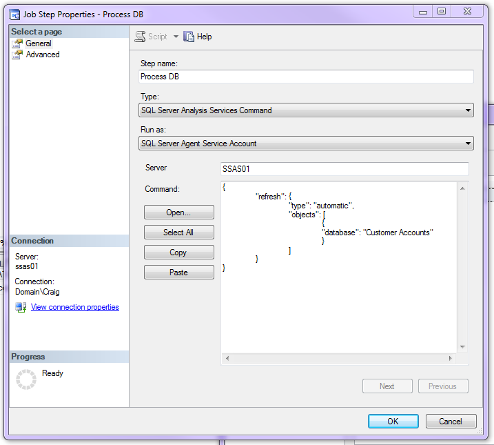 Ya que TMSL es sólo soportado en SQL Server 2016, usted no podrá configurar este trabajo de SQL Agent como se mostró arriba. Para hacer esto, podemos envolver el código JSON en XMLA, el cual puede ser manejado por un trabajo de SQL Agent 2012 o 2014. Aquí está un ejemplo:
