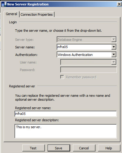 Figura 2. New Server Registration Usted puede añadir la información de autenticación de los servidores para conectarse a ellos. Usted puede probar la conexión y añadir una descripción.