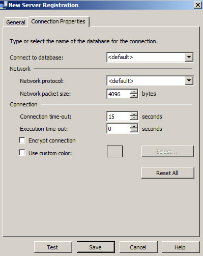 Figura 3. Propiedades de conexión Usted puede opcionalmente definir en la pestaña Connection Properties a qué base de datos conectarse por defecto, el protocolo de red (TCP-IP, Memoria Compartida o Canalizaciones con Nombre). Usted también puede definir el tamaño del paquete. Si ejecuta muchas operaciones en masa, puede que sea conveniente incrementar el tamaño del paquete. Si no realiza muchas operaciones, la otra mano puede reducir el tamaño del paquete para incrementar la eficiencia..