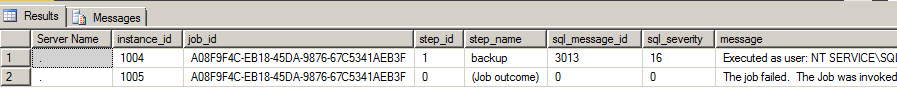 123456789101112131415161718SELECT [instance_id],[job_id],[step_id],[step_name],[sql_message_id],[sql_severity],[message],[run_status],[run_date],[run_time],[run_duration],[operator_id_emailed],[operator_id_netsent],[operator_id_paged],[retries_attempted],[server]FROM [msdb].[dbo].[sysjobhistory]where run_status=0La información del historial de trabajos está en la tabla de sistema sysjobhistory; run_status muestra el estado del trabajo. Si el estado del trabajo es 0, significa que el trabajo falló. Si el estado es 1, significa que el trabajo corrió exitosamente. 2 es que el trabajo reintentó y 4 que el trabajo fue cancelado.