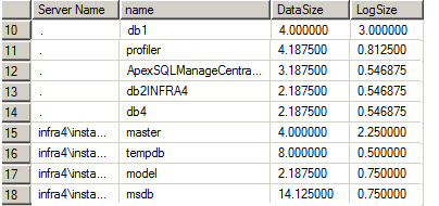 123456789101112with fas(select database_id, type, size * 8.0 / 1024 filesizefrom sys.master_files)selectname,(select sum(filesize) from f where type = 0 and f.database_id = d.database_id) DataSize,(select sum(filesize) from f where type = 1 and f.database_id = d.database_id ) LogSizefrom sys.databases d-