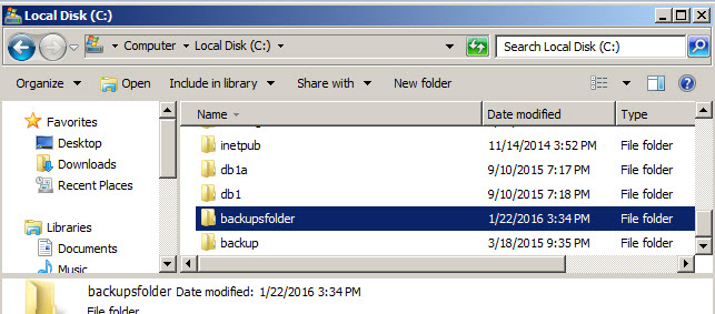 1xp_cmdshell 'mkdir c:\\backupsfolder'Si todo salió bien, usted tendrá una nueva carpeta en el Sistema Operativo: