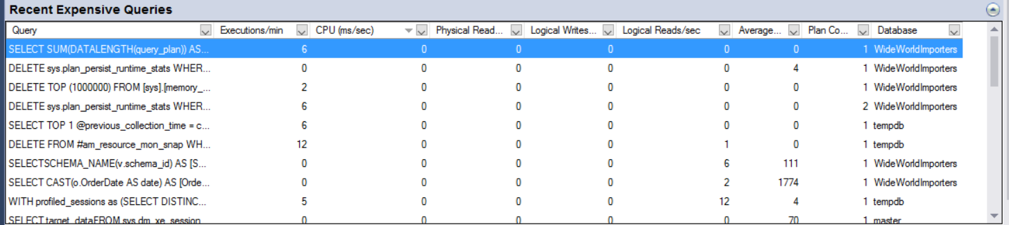 Las consultas consideradas como Active Expensive y Recent Expensive le brindarán información sobre las consultas que tienen Lecturas lógicas o Tiempo transcurrido alto de CPU.