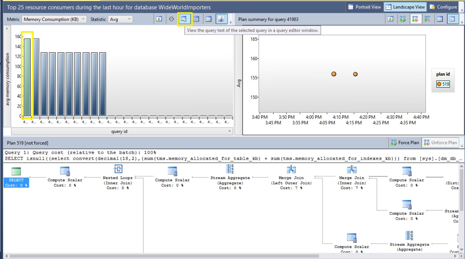 El siguiente paso consiste en resaltar las consultas que consumen muchos recursos. Posteriormente luego de resaltar el valor del gráfico en la ventana del lado izquierdo (como se resalta en la captura de pantalla a continuación) usted obtendrá el plan de ejecución de la consulta en la ventana inferior.