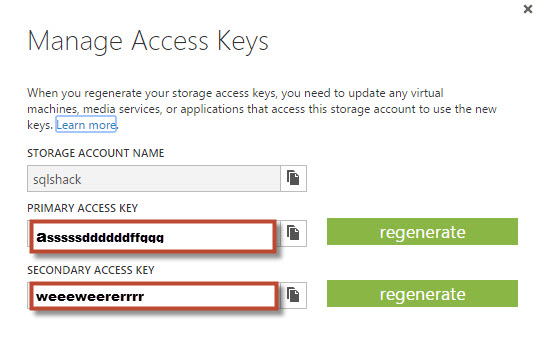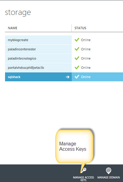 Manage Access Keys es usado para conectarse a SQL Azure. El uso será explicado después.