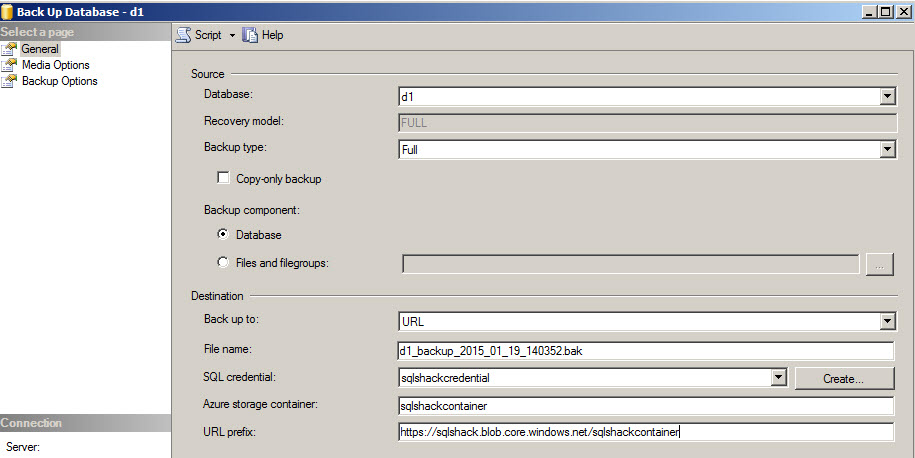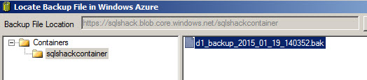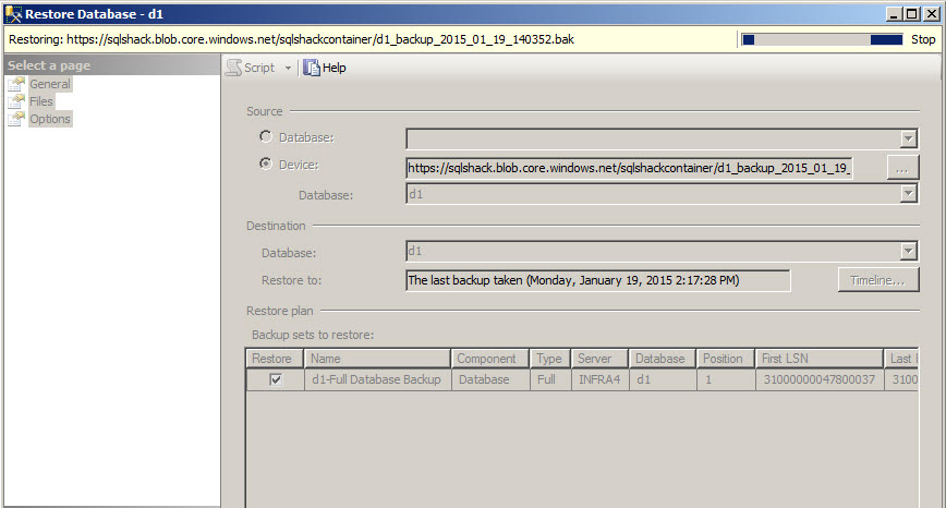 BACKUP DATABASE [d1] TO URL = N'https://sqlshack.blob.core.windows.net/sqlshackcontainer/d1_backup_2015_01_19_171804.bak' WITH CREDENTIAL = N'sqlshackcredential' , NOFORMAT, NOINIT, NAME = N'd1-Full Database Backup', NOSKIP, NOREWIND, NOUNLOAD, STATS = 10 GO |