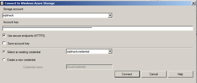 En Storage Account seleccione el nombre de Storage usado en la figura 5, en Access keys, seleccione la llave de acceso de la figura 12. Mantenga el uso de la opción HTTPS. En select an existing credential, use la credencial creada en la figura 14 y presione Connect.