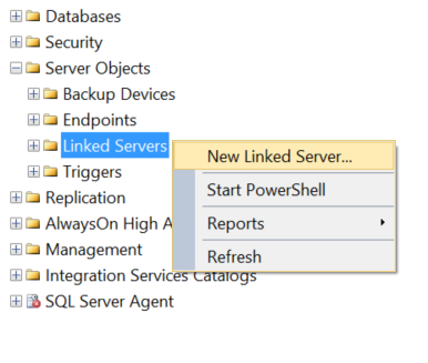 Para configurar un servidor enlazado usando SQL Server Management Studio, expanda el nodo Server Objects desde la ventana Object Explorer. Haga clic derecho en el nodo Linked Server y elija New Linked Server.