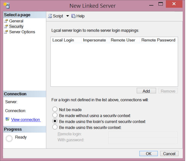 Para los inicios de sesión que no han sido definidos en la lista de mapeo, usted tiene que elegir el contexto de seguridad para sus conexiones al servidor remoto usando ese servidor enlazado. Elegir Not be made evitará que cualquier usuario no incluido en la lista previa use ese servidor enlazado. Seleccionando Be made without using a security contex, los usuarios no incluidos en la lista de mapeo previa se conectarán al servidor remoto usando el servidor enlazado sin especificar un contexto de seguridad para ellos. Si usted escoge Be made using the login’s current security context, entonces la conexión al servidor remoto será establecida usando el usuario que se está conectando, lo cual es la mejor opción. En la opción Be made using this security context, especifique las credenciales de SQL Server Authentication que serán usadas para establecer la conexión al servidor remoto para los usuarios no definidos en la lista de mapeo.