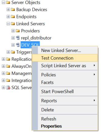 Usted puede asegurarse de que el servidor enlazado está trabajando bien haciendo clic derecho en ese servidor enlazado y elegir Test Connection como sigue: