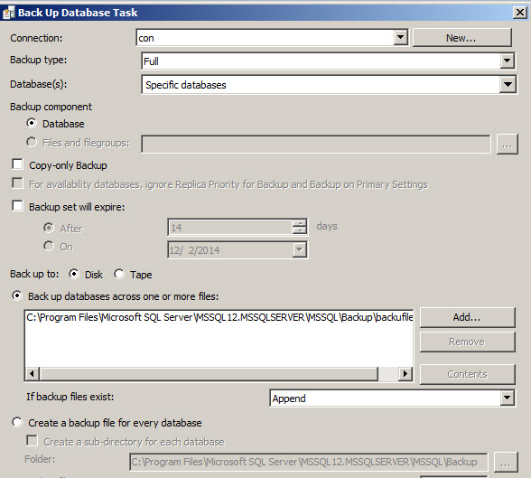 Figura 13 Usted puede respaldar archivos individuales y grupos de archivos, usted también puede usar la opción Copy Only, la cual le permite respaldar la base de datos sin cambiar la Base de Datos y sin afectar los procedimientos de respaldo regulares. Podemos especificar también las fechas de expiración para las copias de seguridad y Adjuntar o Rescribir la copia de seguridad si ya existe.