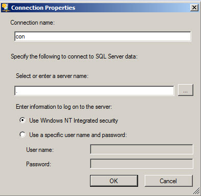 Figura 5 Especifique el nombre para la conexión, el nombre del SQL Server y seleccione un método de autenticación (la Autenticación de Windows es altamente recomendad por razones de seguridad) y presione OK.