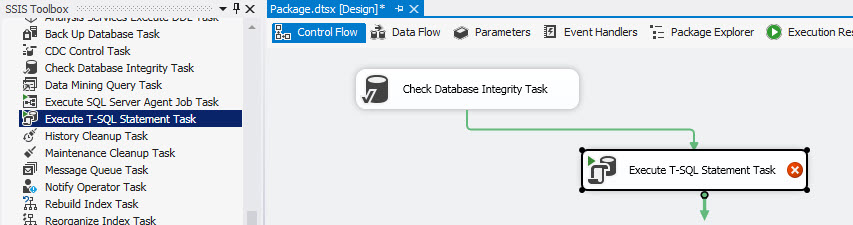 Figura 9 Haga doble clic en la Execute T-SQL Statement Task y añada las tareas con una restricción.