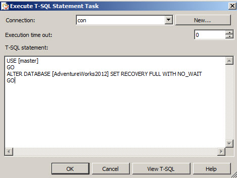 Sólo nos estamos asegurando de que los Registros de la Base de Datos estén en modo de recuperación completo para recuperar bases de datos en cualquier punto de tiempo. Idealmente, eso debería establecerse antes.1234USE [master]GOALTER DATABASE [AdventureWorks2012] SET RECOVERY FULL WITH NO_WAITGO