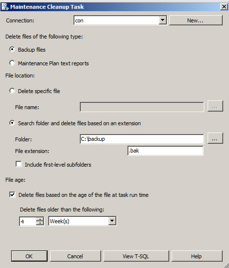 Figura 16 Con Maintenance Cleanup Task, podemos eliminar copias de seguridad antiguas. Es una buena práctica si hay copias de seguridad obsoletas que necesitan ser removidas. Usted puede remover los archivos de Copias de Seguridad y los reportes de texto de Maintenance Plan. Usted también puede especificar el nombre del archivo o buscar carpetas con una extensión específica en una carpeta específica. Usted también puede buscar archivos de copia de seguridad en subcarpetas y especificar cuáles carpetas eliminar de acuerdo a su edad.