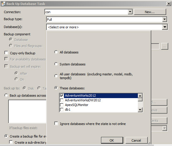 Figura 12 Haga doble clic en Back Up Database Task, use la conexión actual, seleccione Full Backup y una Base de Datos a respaldar.