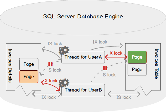 Supongamos que para modificar una fila en la tabla Factura es importante para el Usuario que también debe leer una tabla InvoiceDetails de tal forma que pueda obtener el total que se factura al cliente. Digamos que, sin importar la razón, UserBya ha adquirido un bloqueo exclusivo en una página que contiene una fila de la tabla InvoiceDetails que UserA necesita leer.