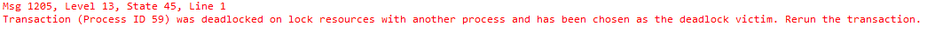 • Una vez que se elige la víctima de interbloqueo, revertirá la transacción de esta víctima y devolverá un mensaje de error 1205 al usuario. El error de mensaje se ve como sigue