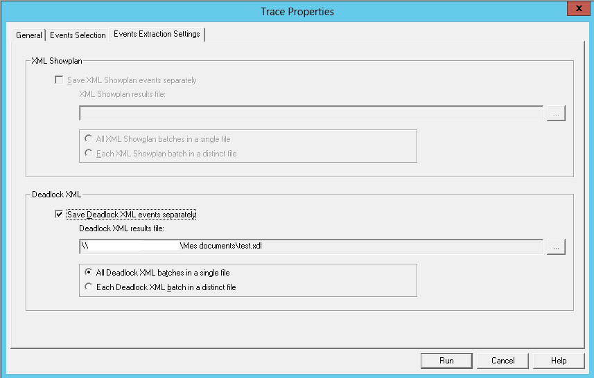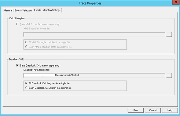 Cuando se selecciona este elemento, podemos ir a la tercera pestaña y especificar ya sea si guardar los eventos XML de interbloqueo en un archivo de resultados separado. Así mismo tendríamos que analizar este archivo con un script o realizar la ejecución de otra cosa.